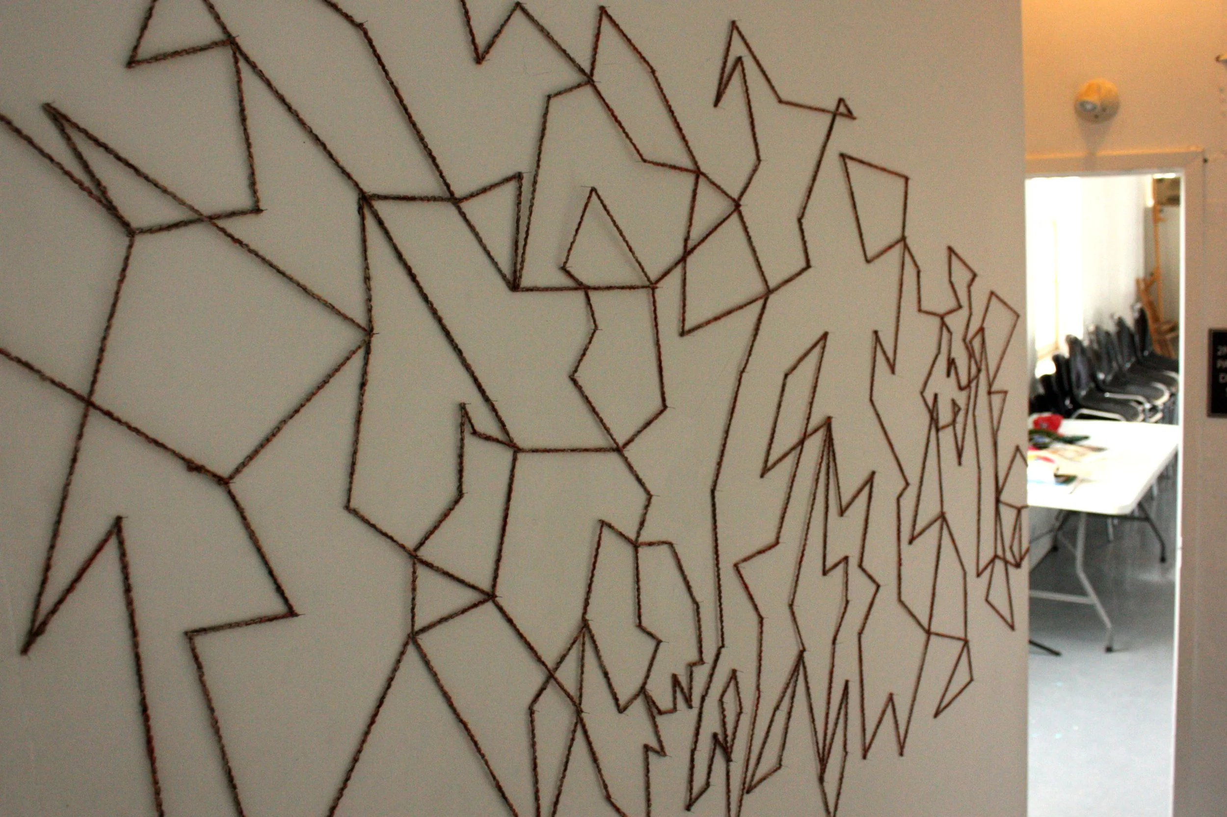grounds of the Centre reflected the natural landscape outside of the building, and visible from the many windows of the open loft space of the 3rd Floor Gallery, while the yarn and pin portion of the installation was reflective of the shapes present in Tinkl's